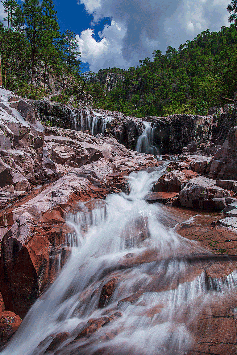 La distancia desde Tepehuanes hasta la cascada suena manejable: 150 kilómetros. Sin embargo, adentrarse en la sierra implica un viaje lleno de paradas para capturar paisajes increíbles. De esos 150 km, unos 90 son pavimentados, luego sigue terracería y, finalmente, 20 km de brecha donde incluso se necesita una motosierra para despejar el camino. Llegamos a la cima de la cascada, pero un fuerte chubasco nos impidió tomar fotos, así que tuvimos que regresar.